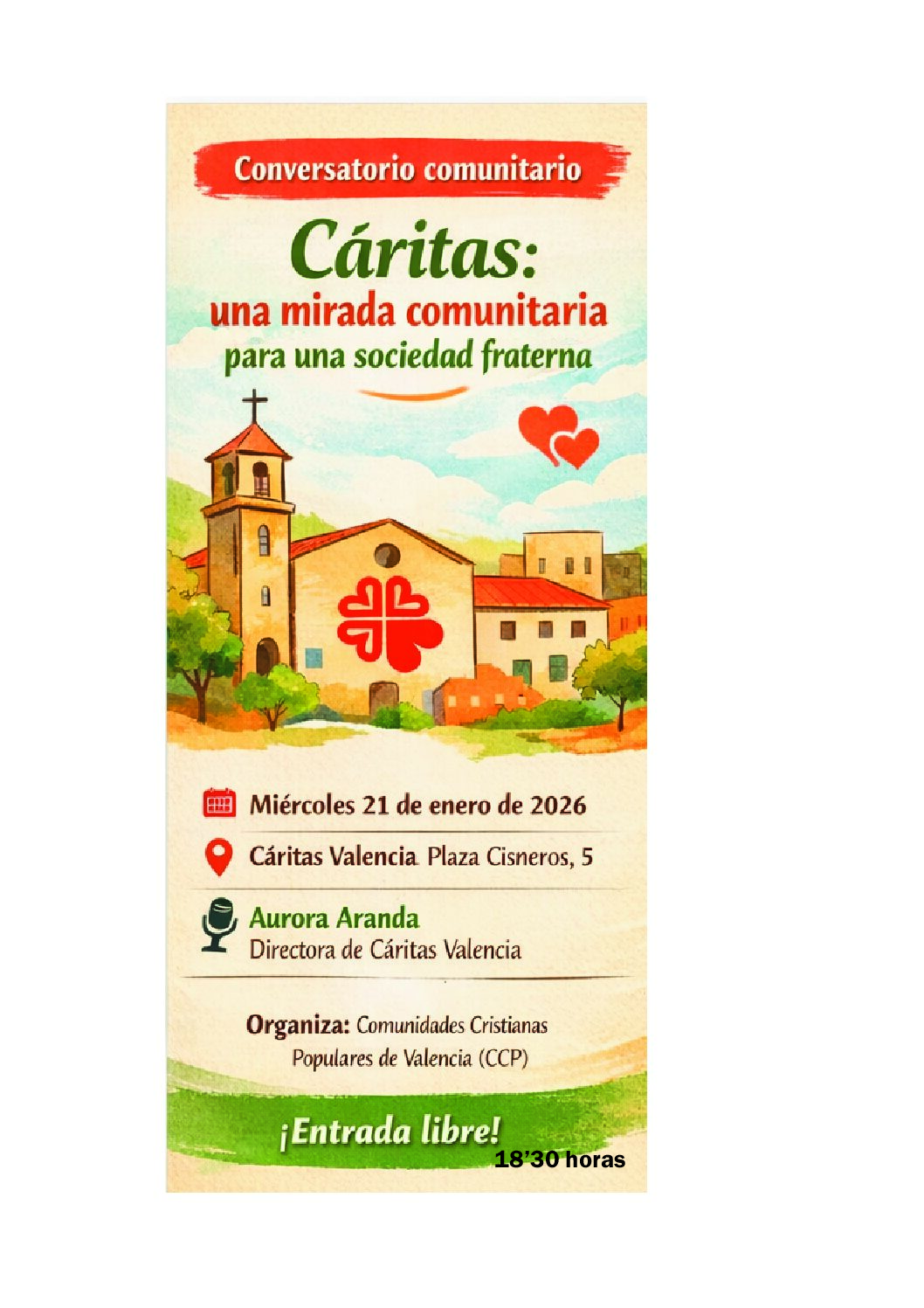 Desde Comunidades Cristianas Populares, invitamos a un conversatorio con Aurora Aranda, Directora de Cáritas Valencia, el día 21-1-26, a las 18,30 en la sede Cáritas Valencia, plaza Cisneros 5.  (ver cartel adjunto)
